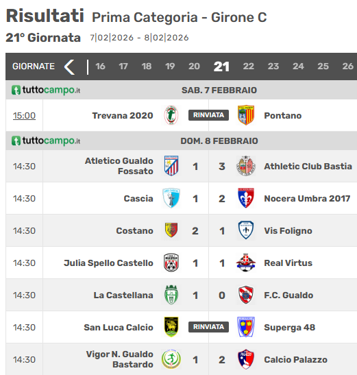 GUALDO: Sergiacomi, Bensi, Giacometti (24’ st Rossi), Monacelli (1’ st M. Fedeli), Masci, Passeri, Scaramucci (1’ st Collarini), Favaro, Sias, Scassellati (22’ st Massa), Carocci (1’ st Pasquarelli). A disp.: Bonatti, Ercolanoni, Biscontini, Petrini. All.: Buttò.