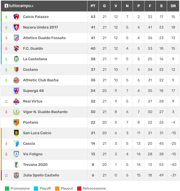 Finisce 1-0, con il Gualdo che per la prima volta in stagione perde per due domeniche di fila e, complici anche gli altri risultati, scende al quarto posto, a -1 dall’accoppiata Atletico Gualdo Fossato-Nocera e a -3 dalla nuova capolista Palazzo. Tendenza che andrà subito invertita da domenica prossima, quando al Luzi arriverà la Nuova Gualdo Bastardo.