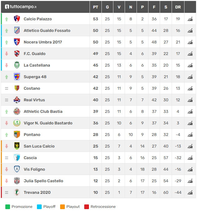 Domenica prossima sarà di nuovo trasferta sul campo della Pontano. In classifica, a cinque giornate dalla fine, il Palazzo rimane primo con il Gualdo che scivola al quarto posto, a -4 dalla vetta e -1 dal duo Atletico Gualdo Fossato-Nocera Umbra.
