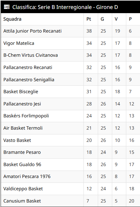 Svethia Recanati: Buzzone 20, Marcone ne, Gurini 8, Urbutis 27, Andreani, Semprini, Zomero 9, Sabbatini, Kossowski ne, Pozzetti 17, Ndzie ne, Magrini 11. All. Schiavi
